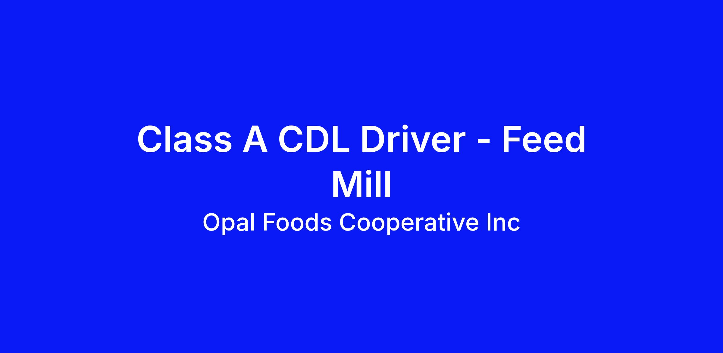 Opal Foods is looking for a Class A CDL Driver. This position is responsible for safely hauling loads of feed locally to various company facilities and contract farms while maintaining compliance with all company policies, DOT rules, and governmental regulations.