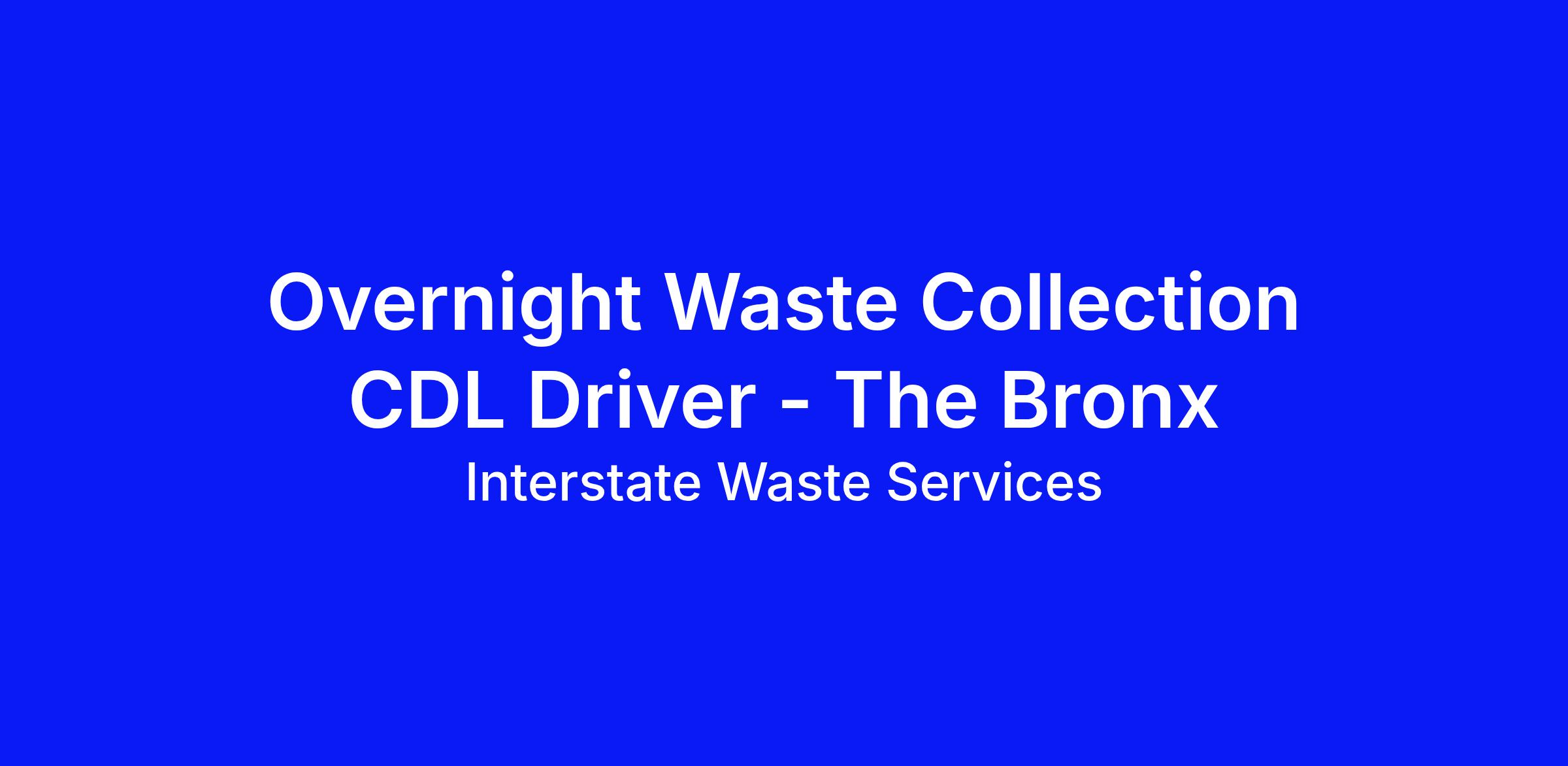 We are seeking a Waste Collection CDL Driver who will be working out of our Bronx Depot (315 Casanova St, Bronx, NY 10474) and reporting to the Site Manager but is also subject to supervision by Route Supervisors and Dispatchers. This is a full time, Union, non-exempt, hourly position with an overnight schedule starting anywhere between 6pm and 10pm, Sunday evening through Friday evening but may vary depending on business needs. Shifts may vary from 10 to 12 hours per evening or until the route is complete.