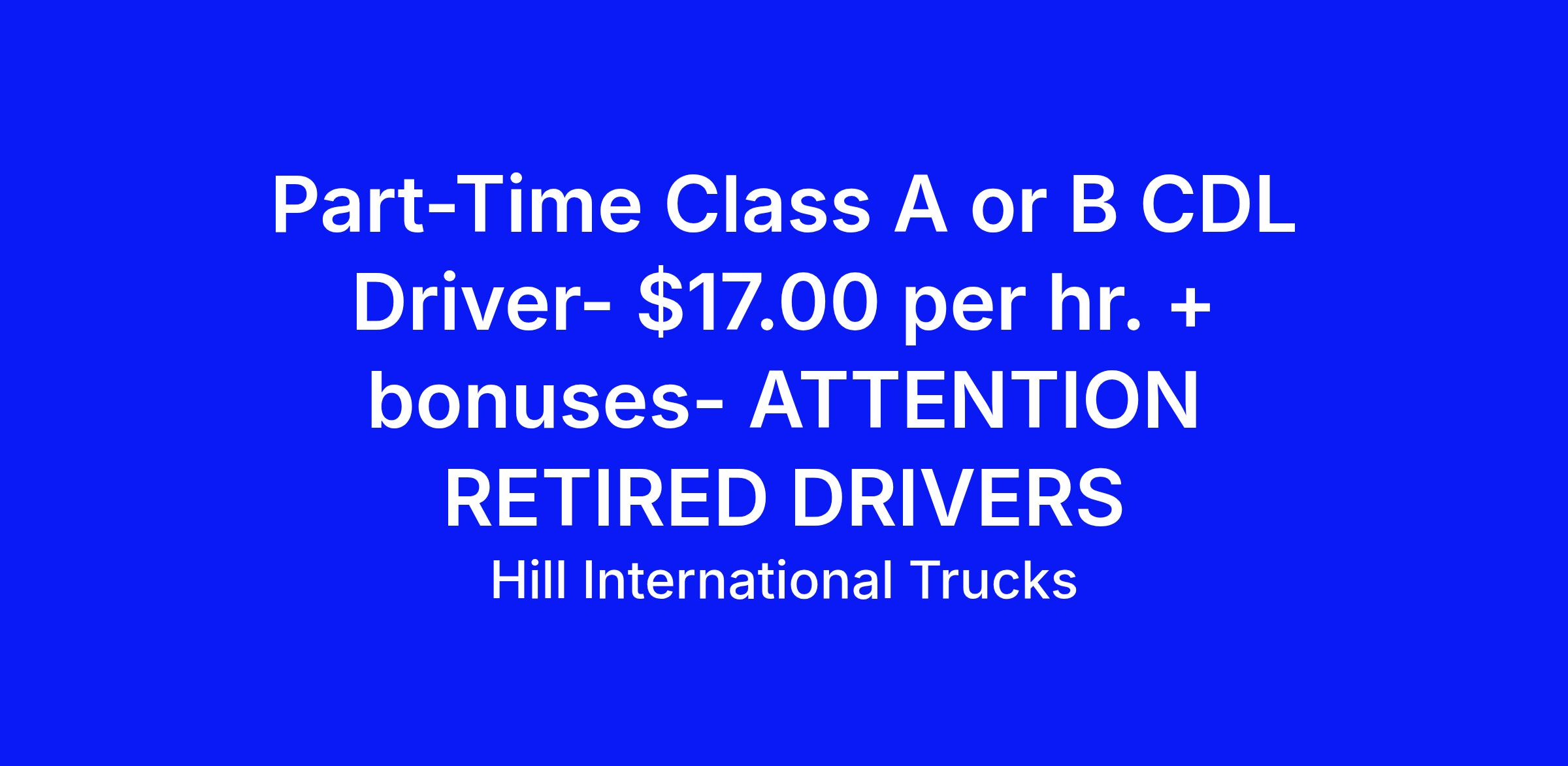 Are you an experienced Class A or B CDL Driver? Hill International Trucks, a leading medium- and heavy-duty truck and trailer dealership located in Marietta, OH. is currently looking to fill positions for part-time Class A & B CDL Drivers. With flexible hours and competitive pay. This is a great opportunity for retirees or professional drivers looking to earn additional income.
