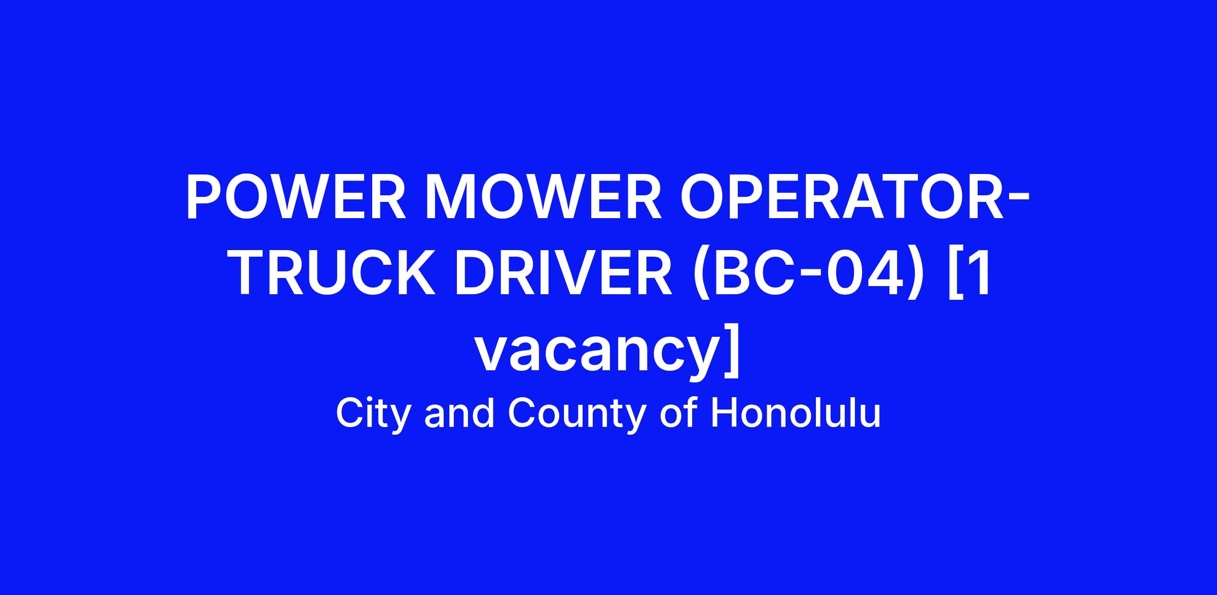 The Department of Parks and Recreation, Park Maintenance and Recreation Services Division, is hiring for a Power Mower Operator-Truck Driver in District IV (Kailua, Waimanalo, Kaneohe, Hauula-Kahuku, Waialua) to maintain beautiful landscapes, perform light equipment repairs, and transport mowing equipment between sites.