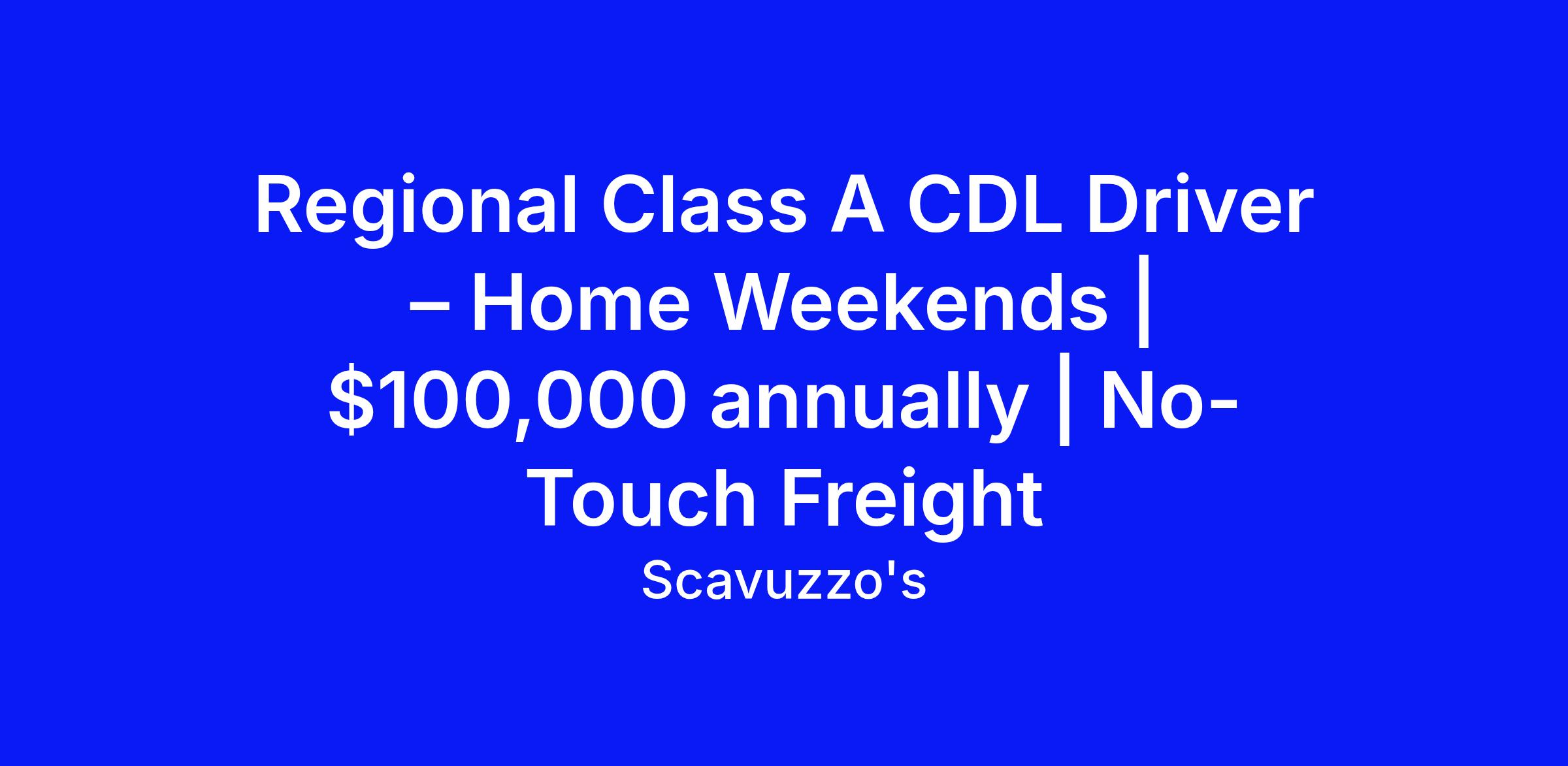 Regional Class A CDL Driver – Home Weekends | $100,000 | No-Touch Freight Scavuzzo’s Inc.Scavuzzo’s Inc., a well-established, family-owned company, is hiring Regional Class A CDL Drivers. If you’re looking for consistent miles, strong weekly pay, and guaranteed weekends at home, we’d love to talk with you.