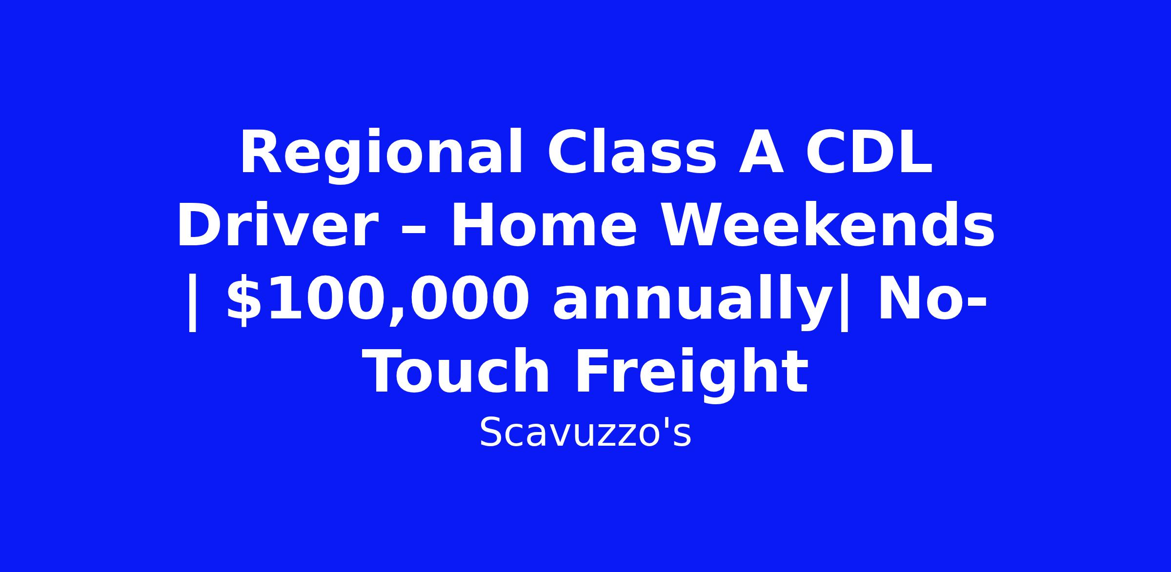 Regional Class A CDL Driver – Home Weekends | $100,000 | No-Touch Freight Scavuzzo’s Inc.Scavuzzo’s Inc., a well-established, family-owned company, is hiring Regional Class A CDL Drivers. If you’re looking for consistent miles, strong weekly pay, and guaranteed weekends at home, we’d love to talk with you.
