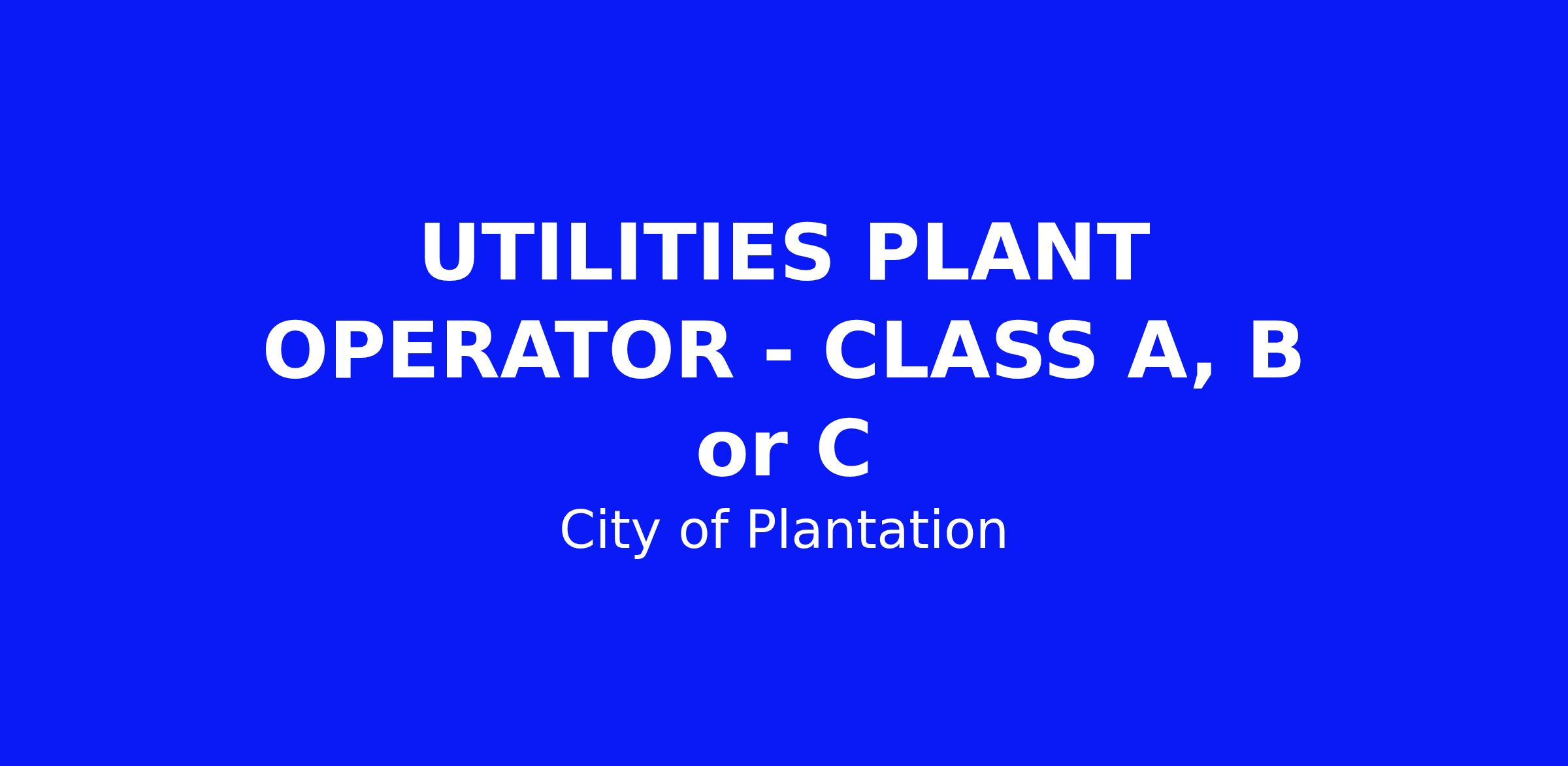 The City of Plantation Utilities department is looking to fill the position of Utilities Plant Operator Class C, B or A for the Water division depending on qualifications and certifications. Below are the ranges for Utilities Plant Operator Class C, B and A ( A being the the highest level).